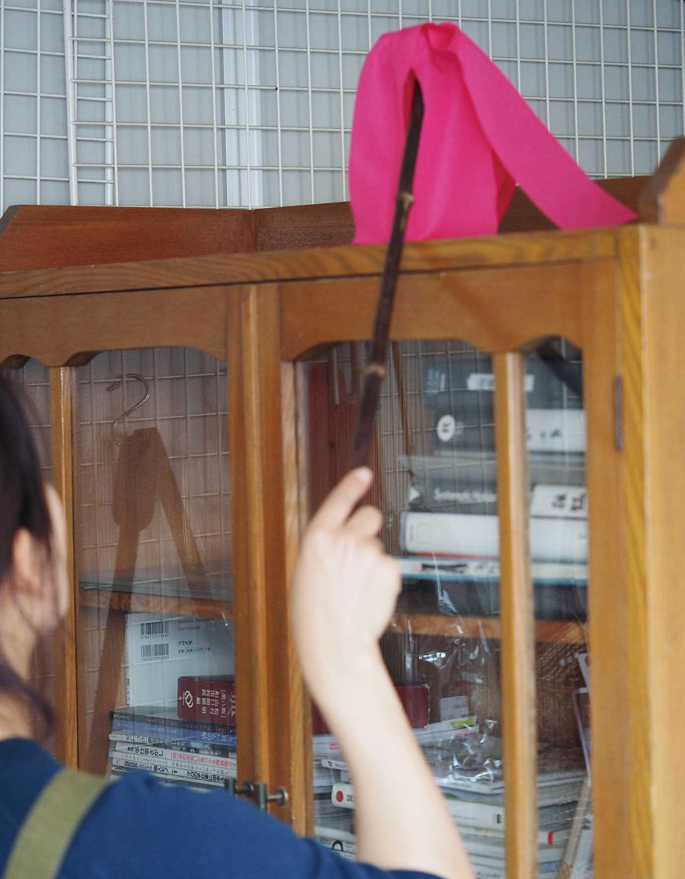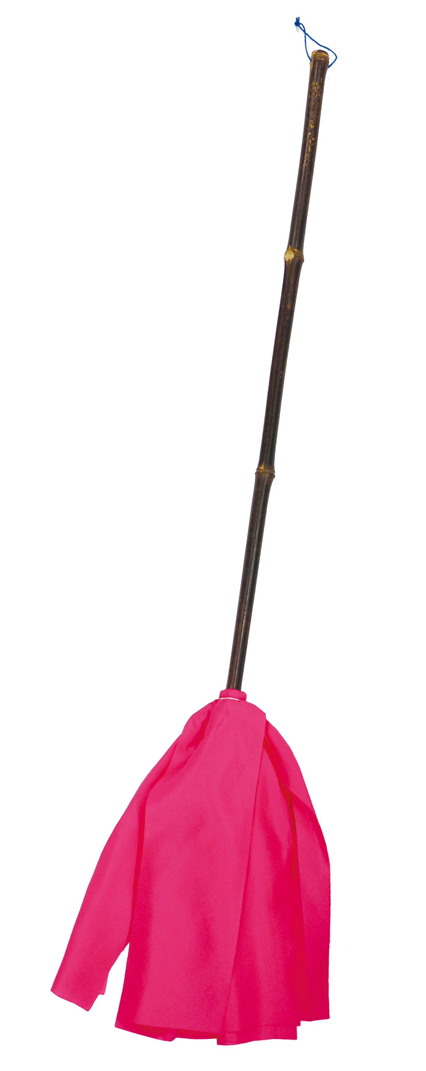 黒竹の柄に際立つピンク色の布をあわせてできたはたきです。