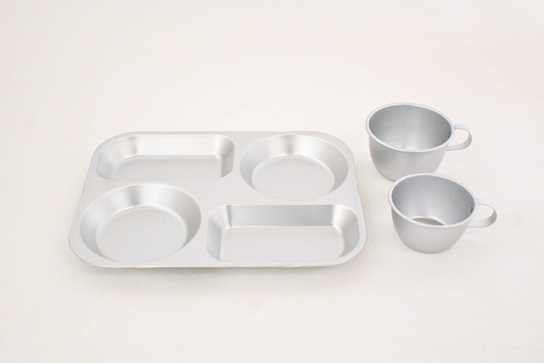 アルマイト加工を施したアルミ製のランチプレートとコップは、軽くて丈夫。