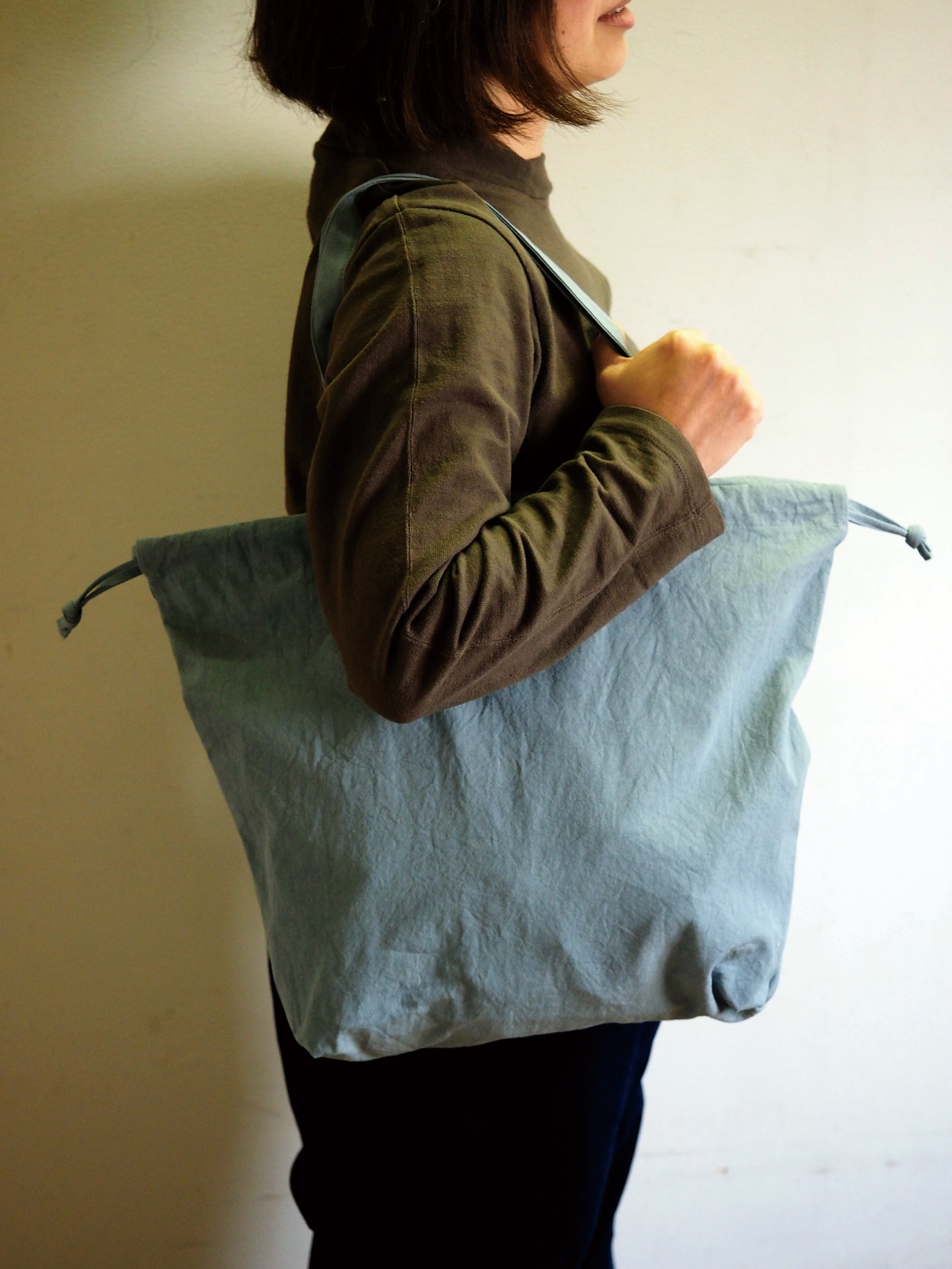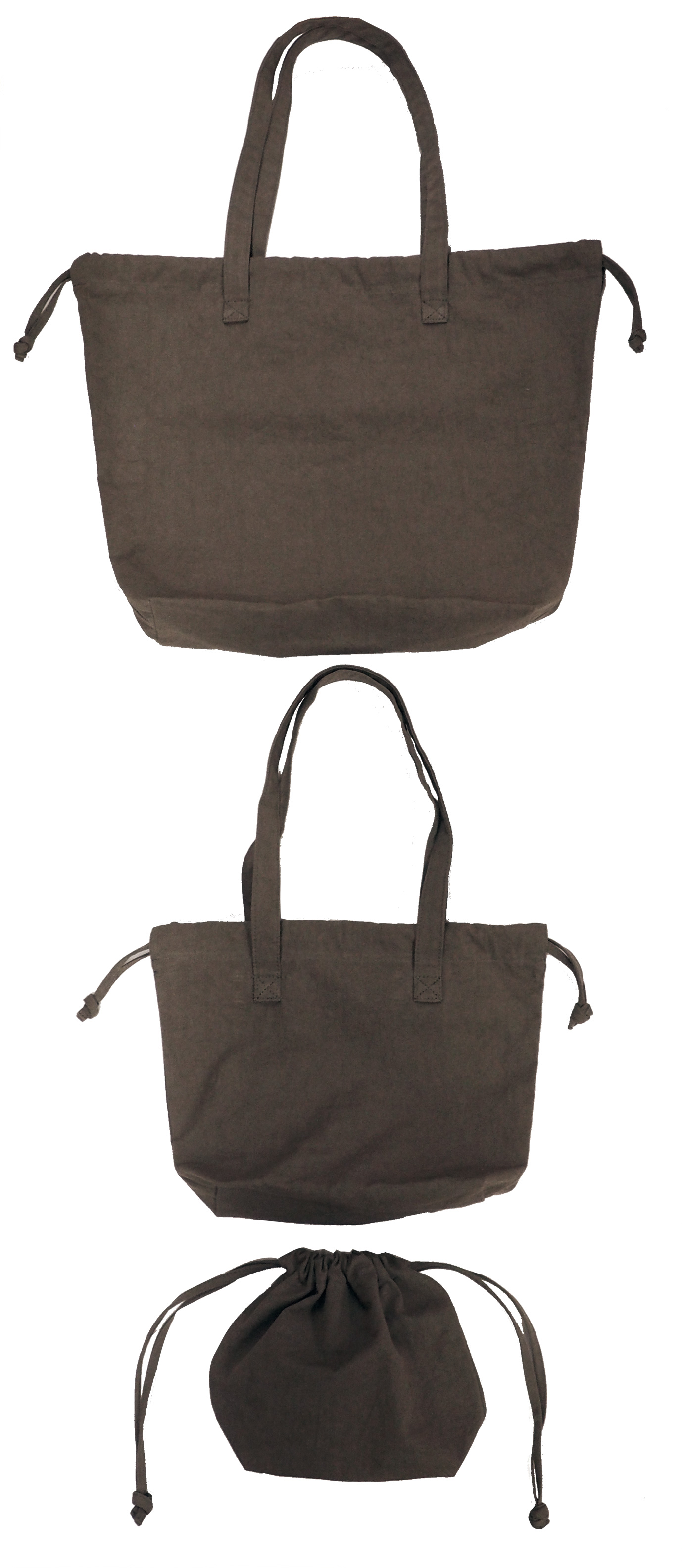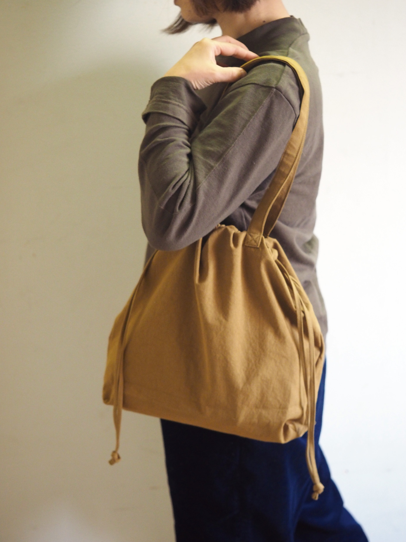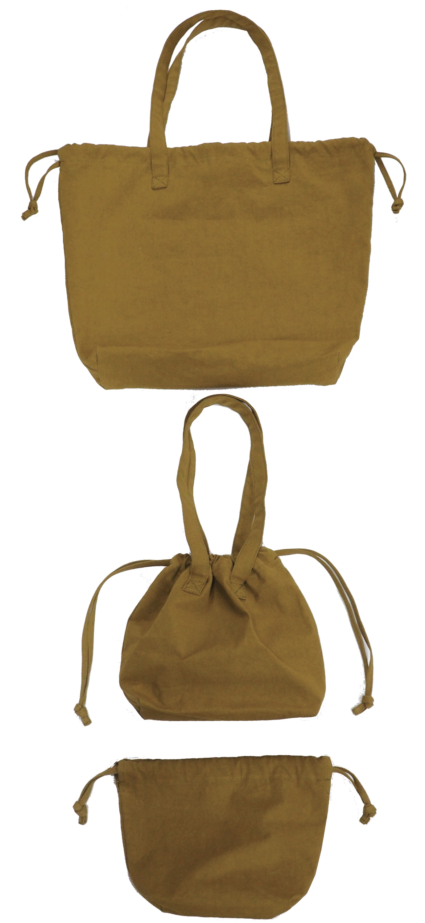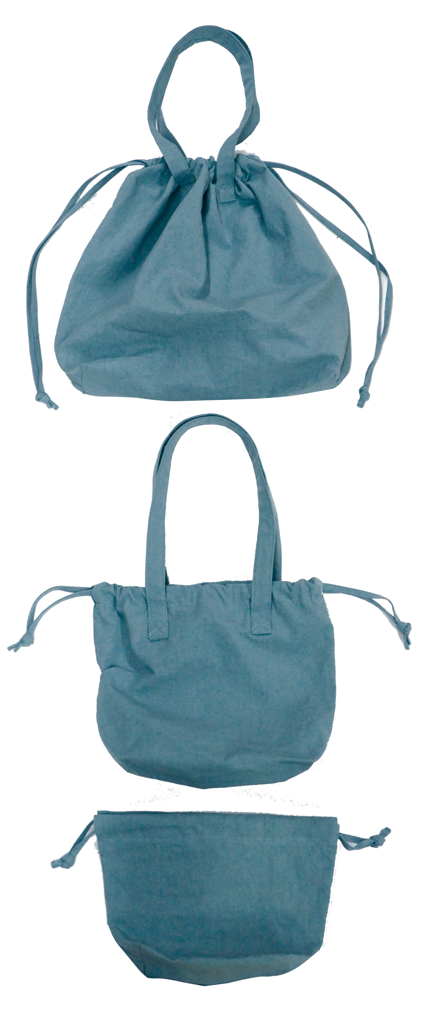 入口の部分が広く、底にはマチがあり、物が出し入れしやすい巾着袋です。