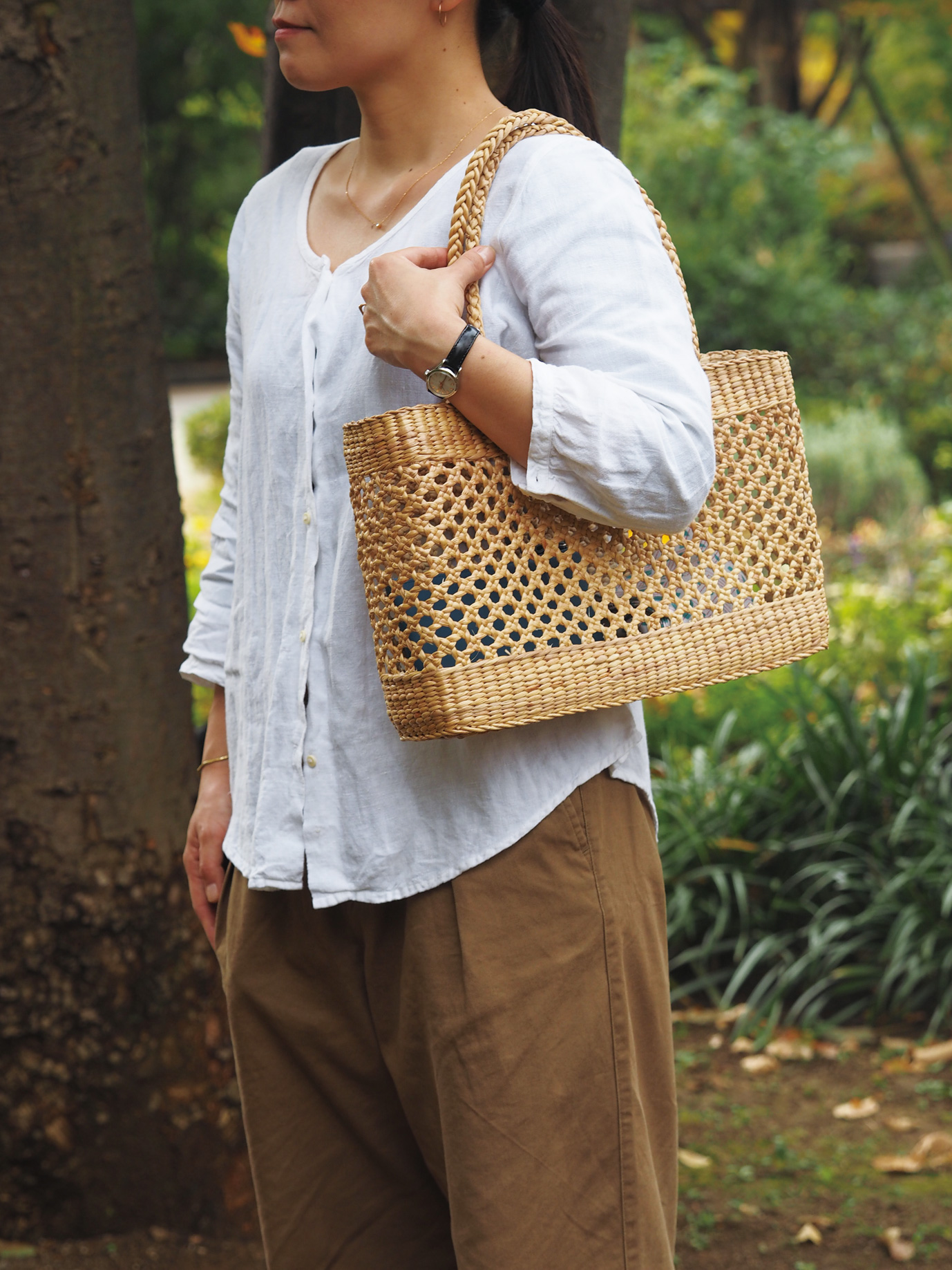とてもしっかりときれいに編んであるので、多少の重いものを乗せても大丈夫です。