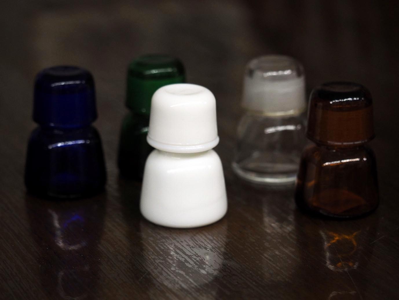 Japan(Tokyo)青・緑・クリア・乳白・茶の5色です。