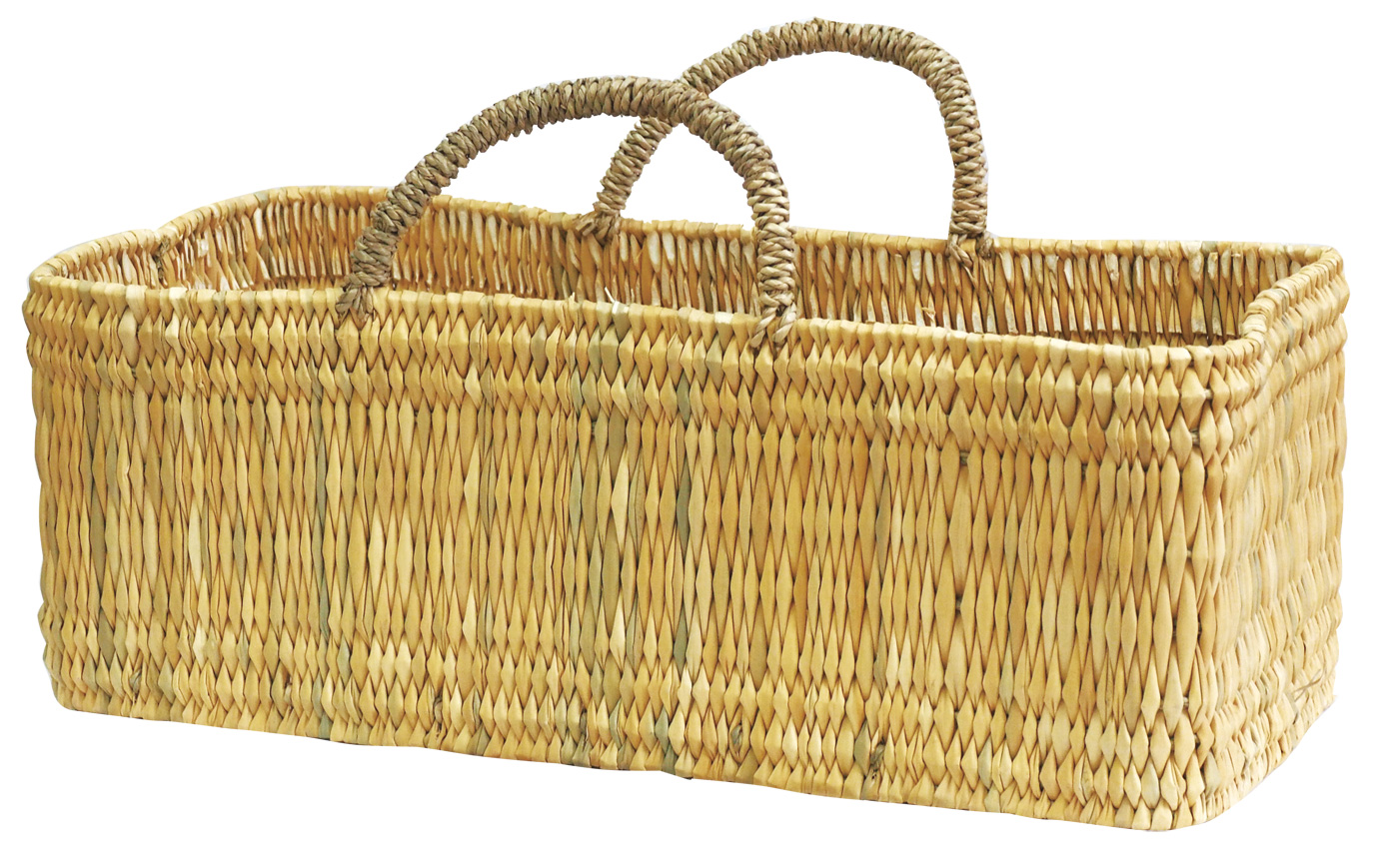 ストロー状の水草で編んだ、横長タイプのバスケットです。