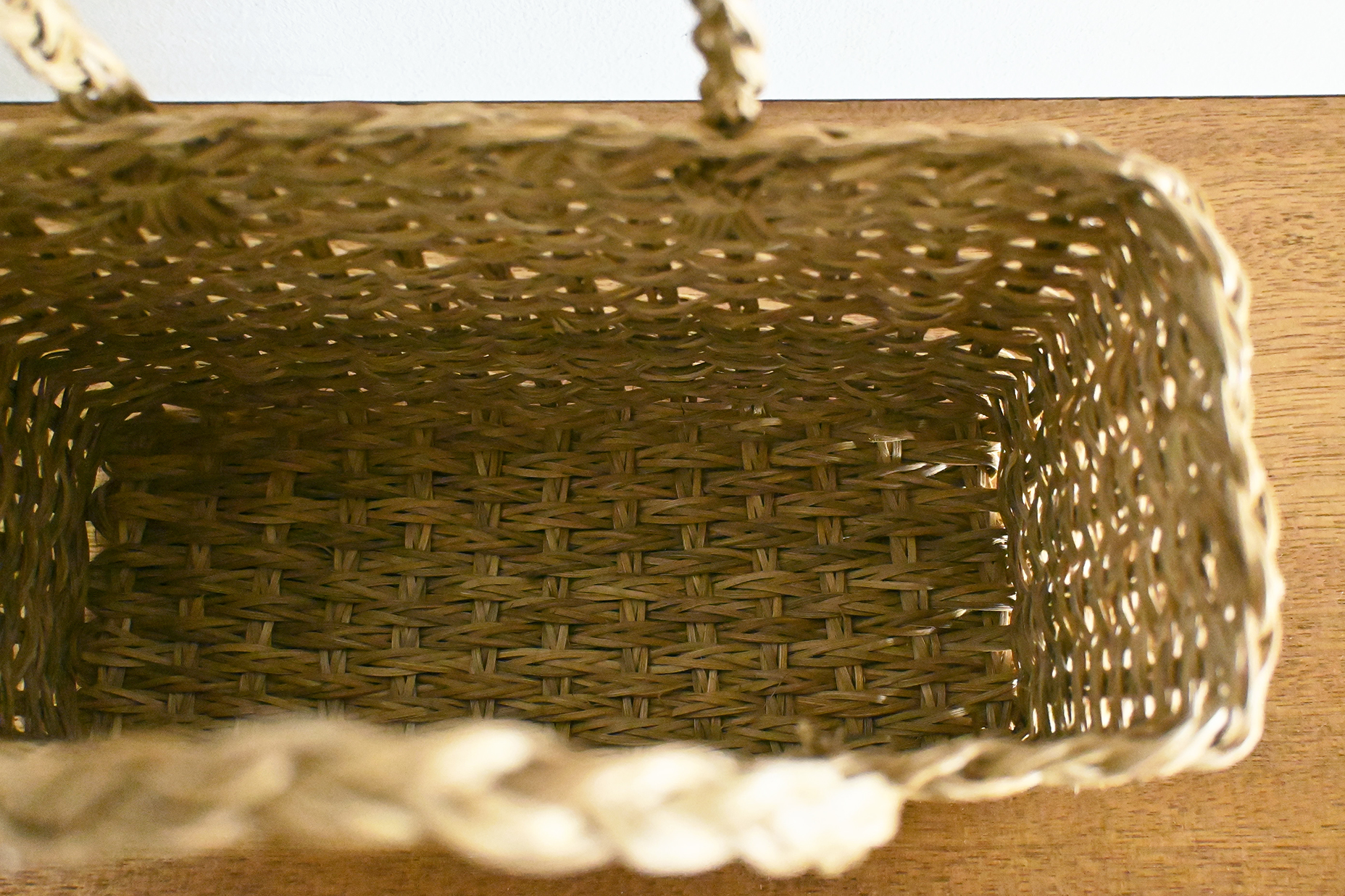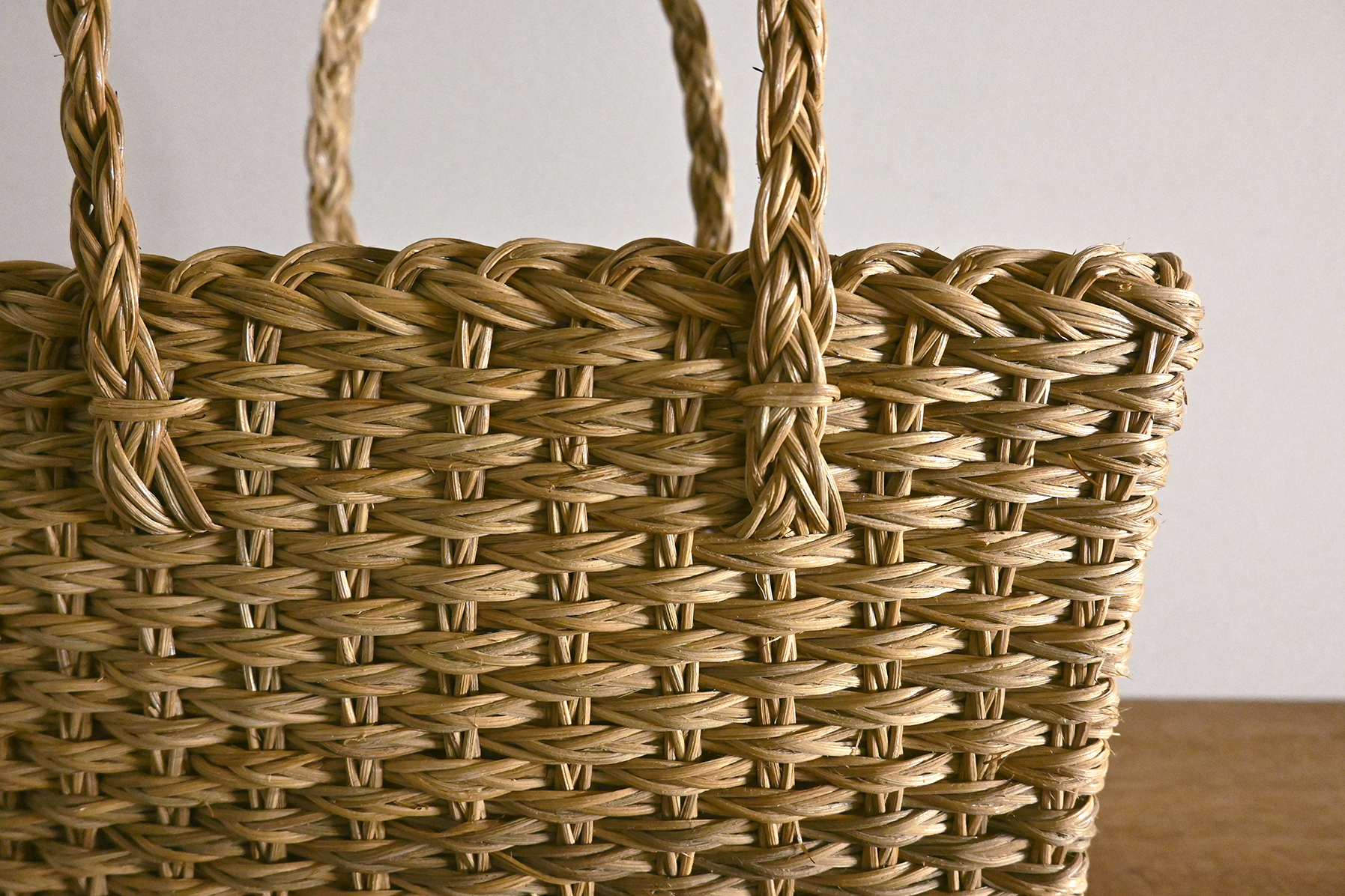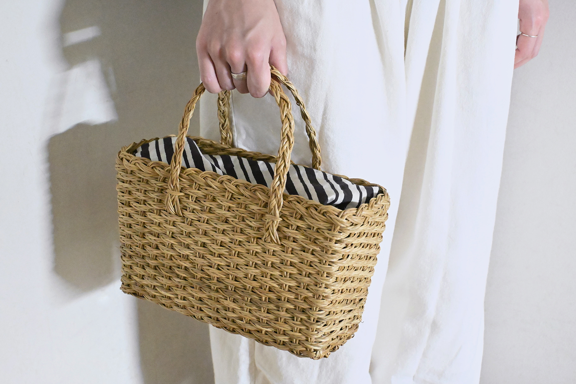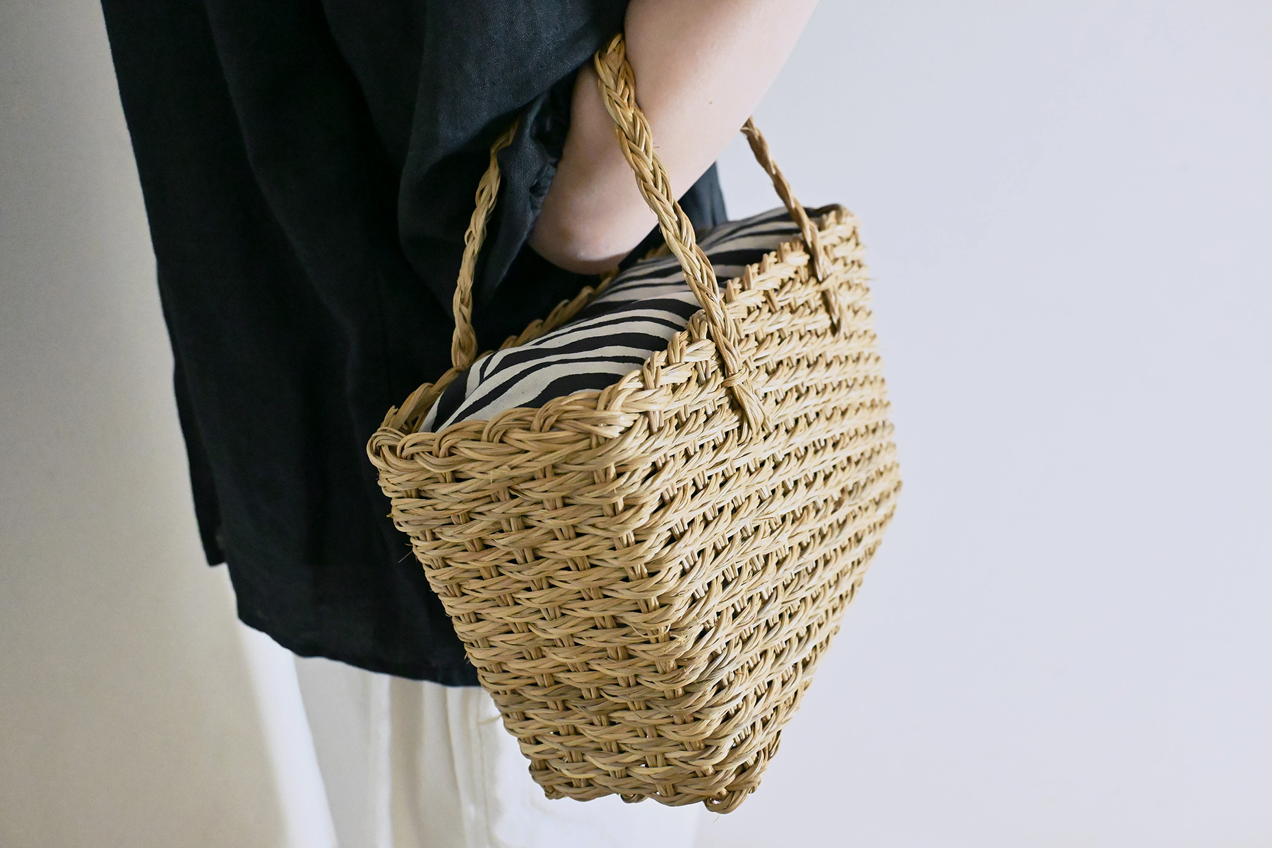 三つ編みにした籐で編まれたカゴバッグ。