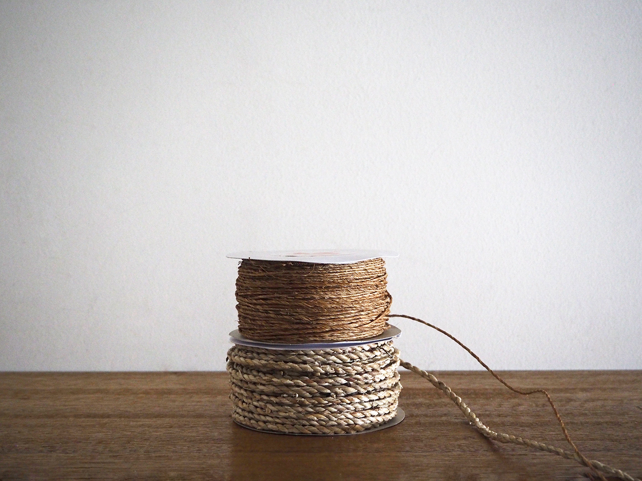 写真上が細い麻のひも、下が少し太めの水草のひもです。