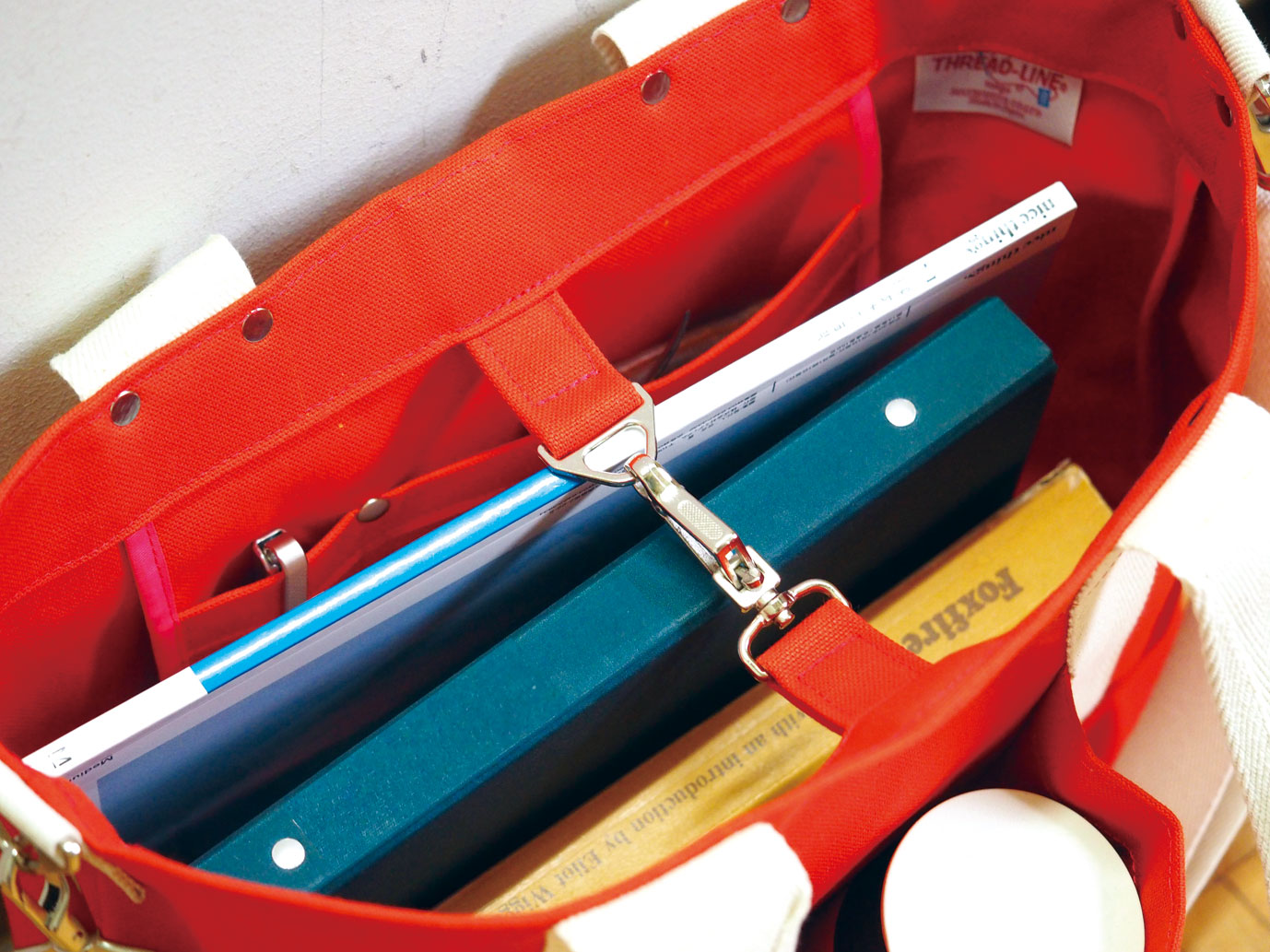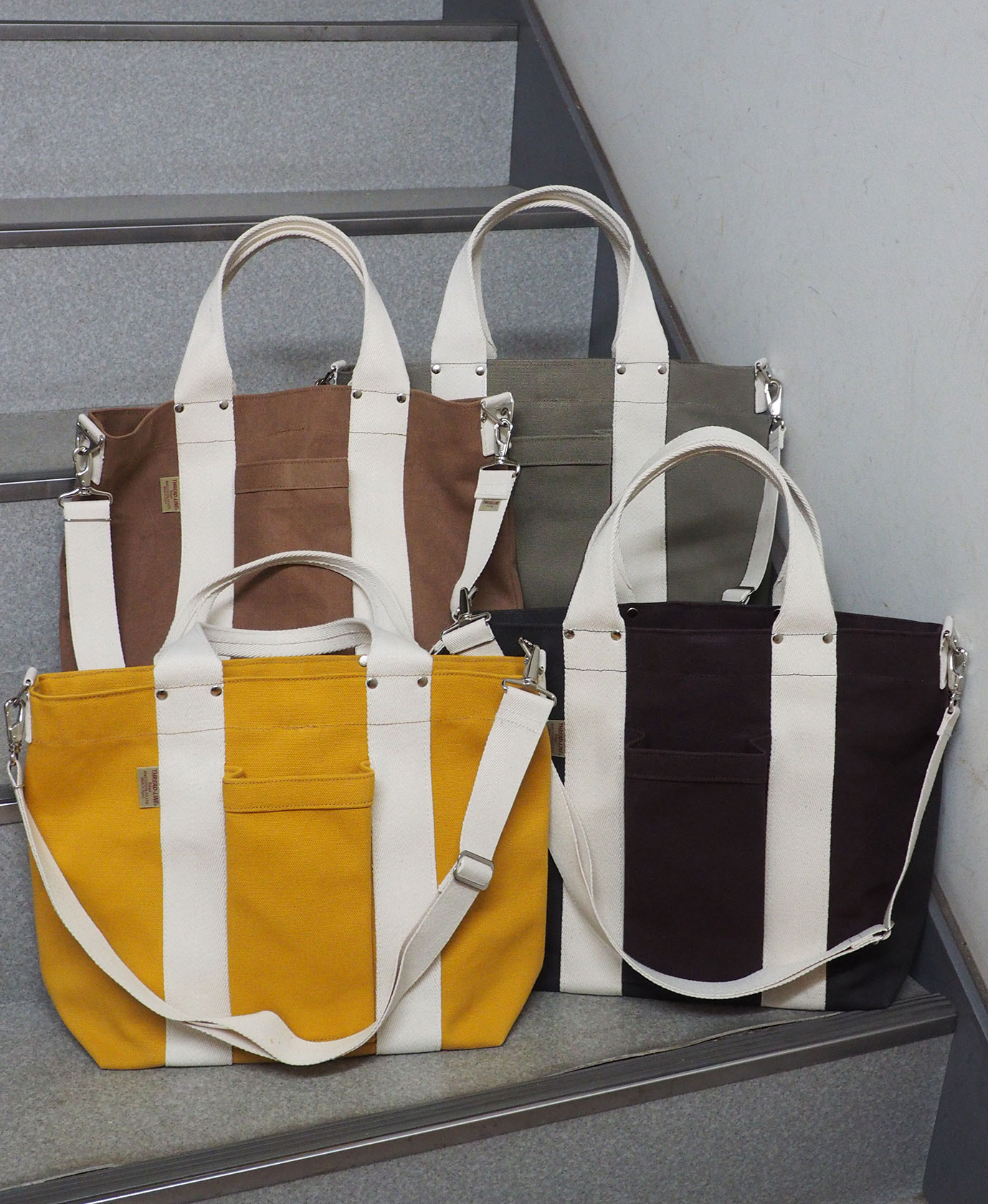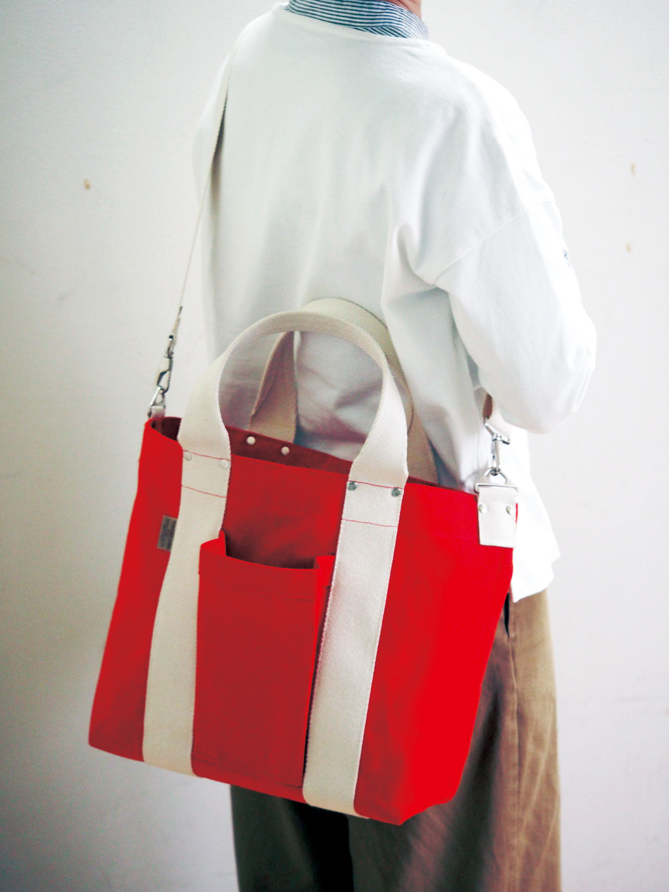 持ち手は純綿100%スピンドルテープ51㎜、ショルダーベルトは純綿100%スピンドルテープ38㎜を使用しています。