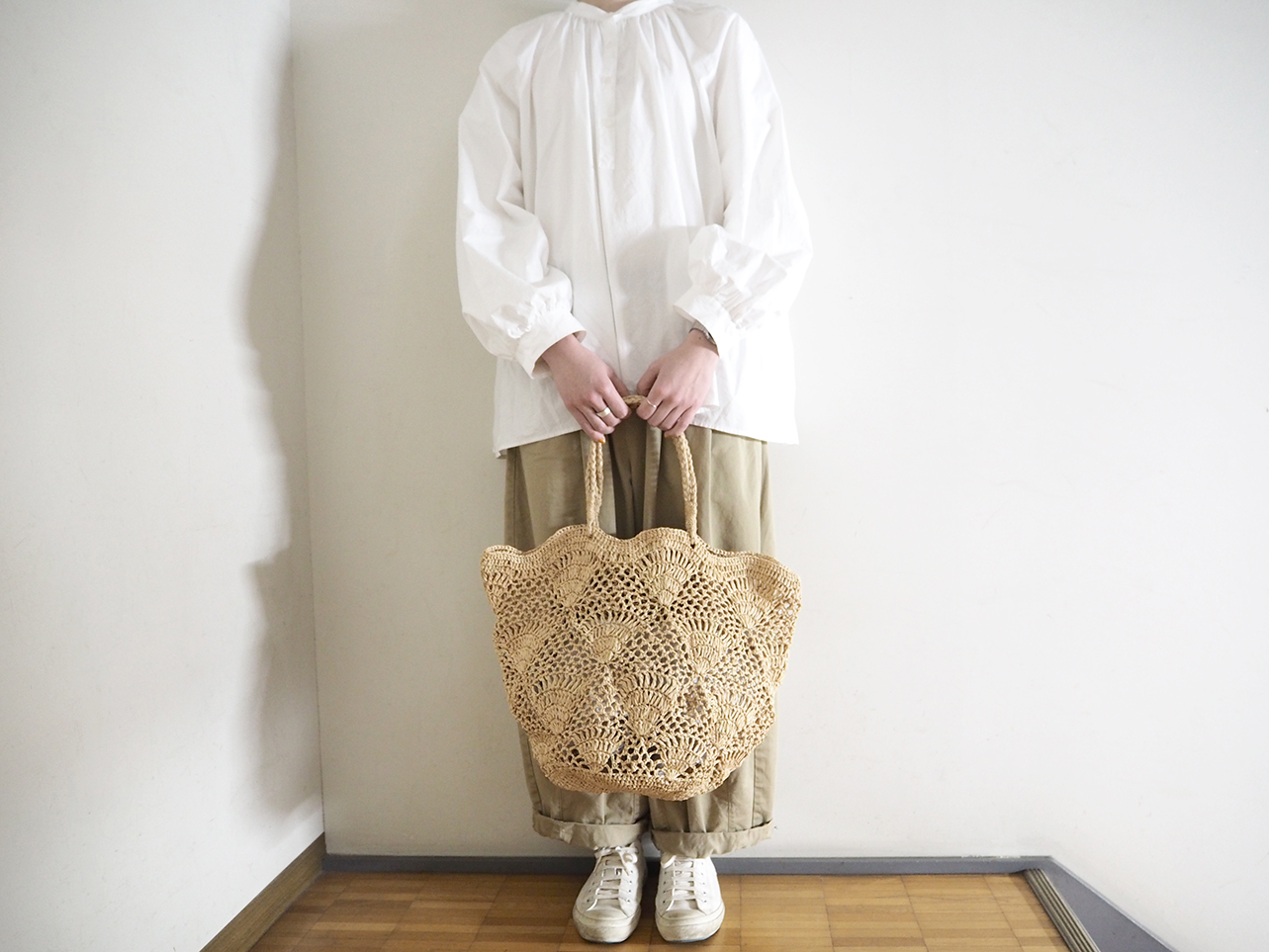 ラフィアかぎ編みバッグ丸底パイナップル柄のご紹介です。