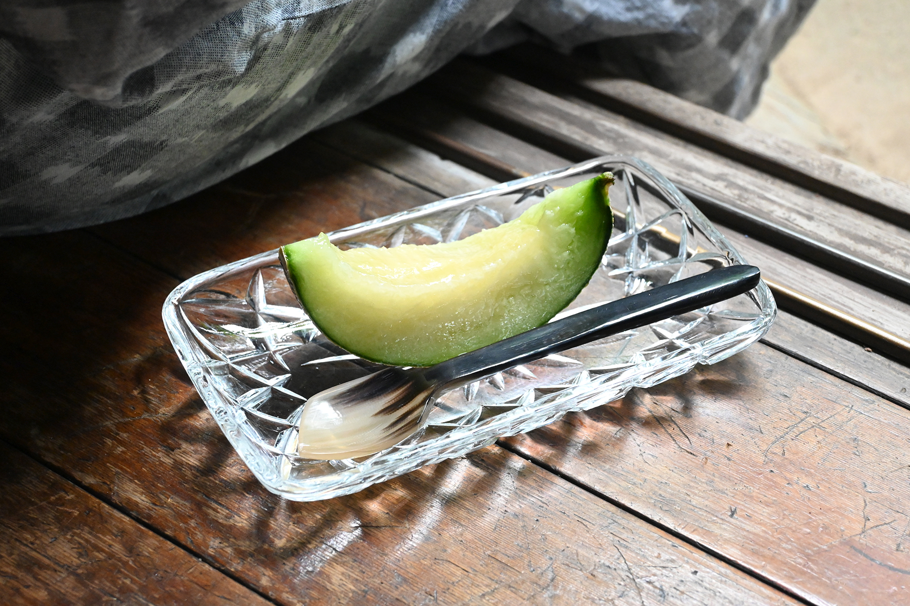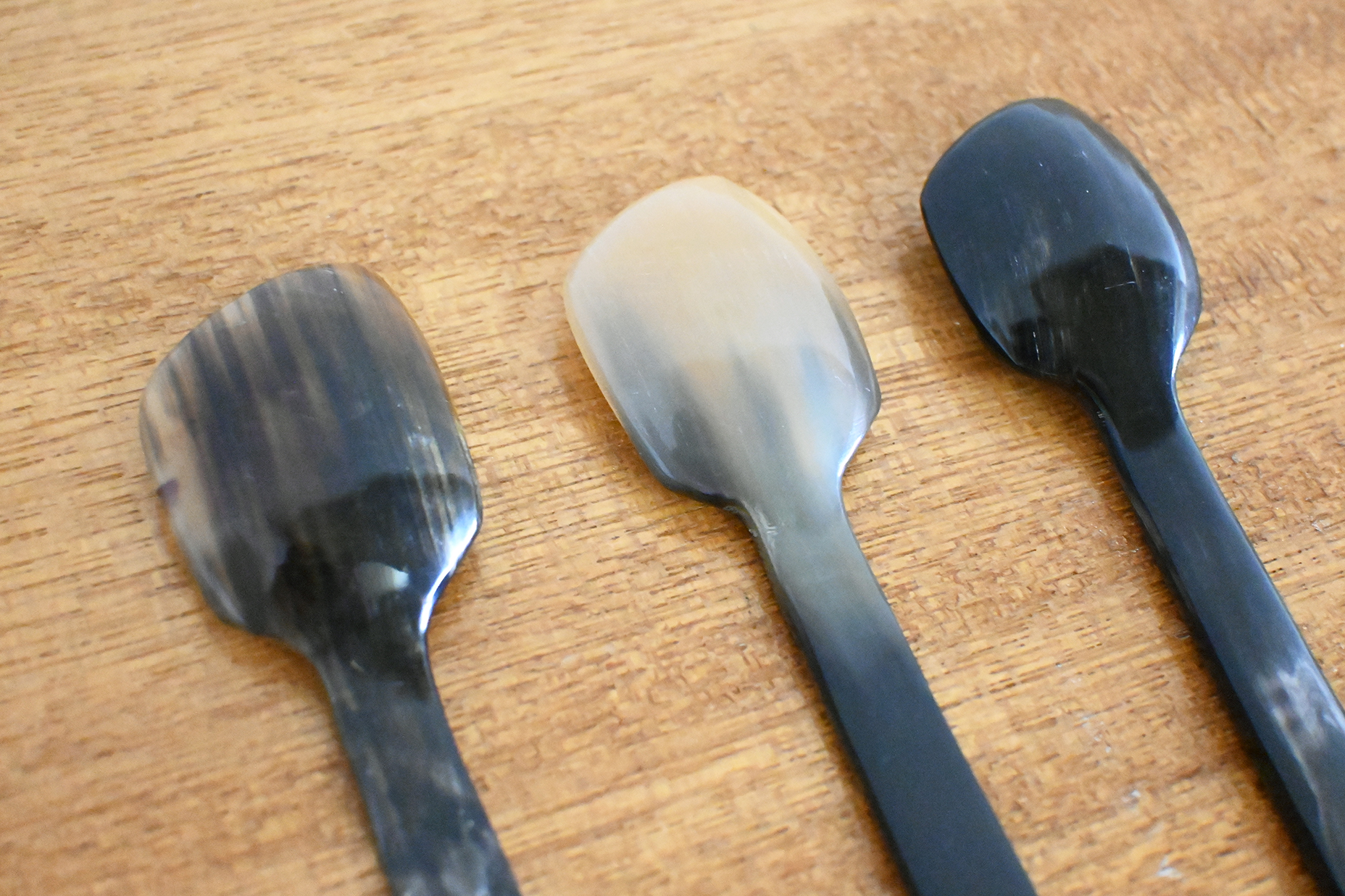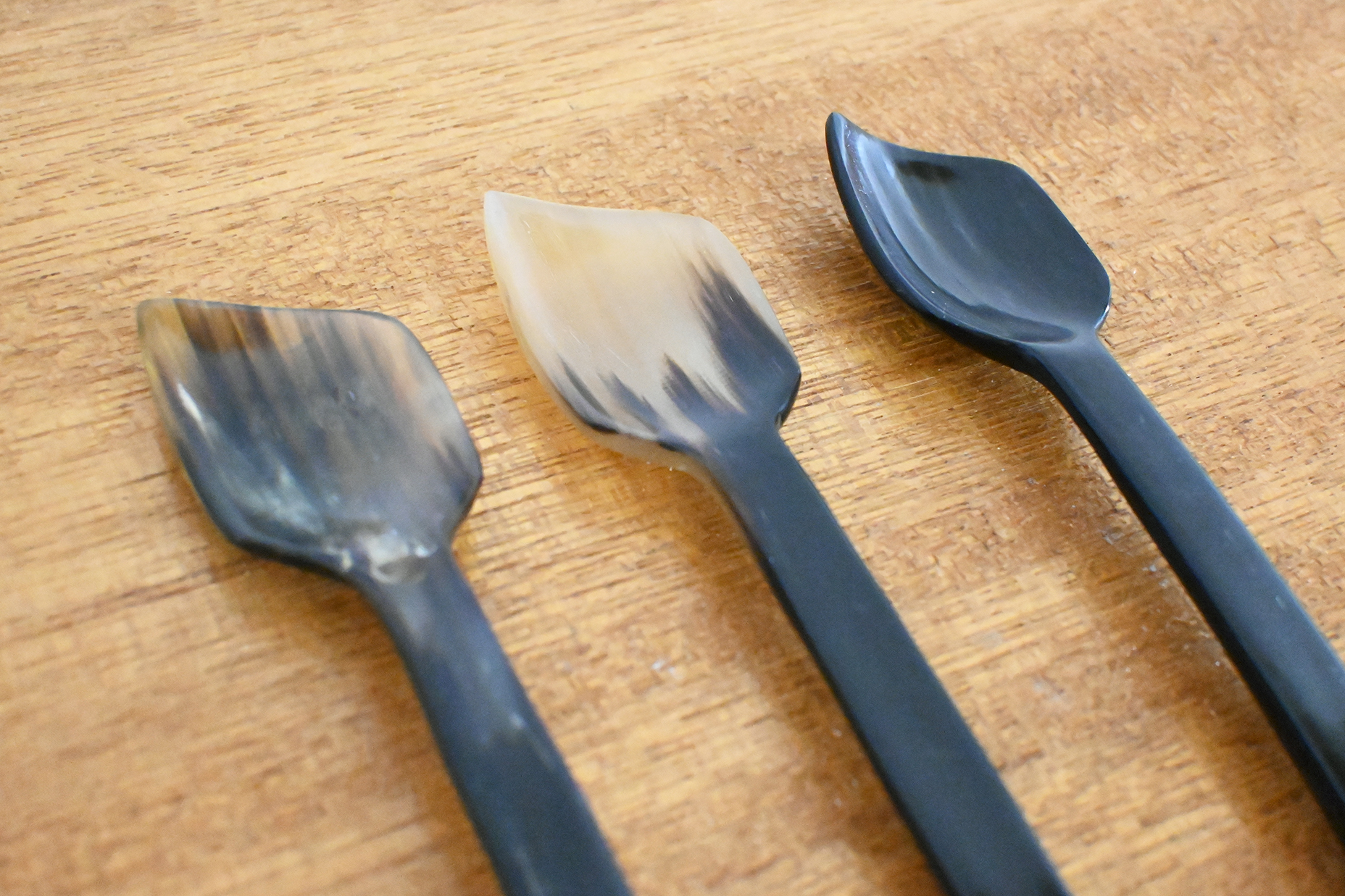 牛角でできた長めでユニークな形状のスプーン。