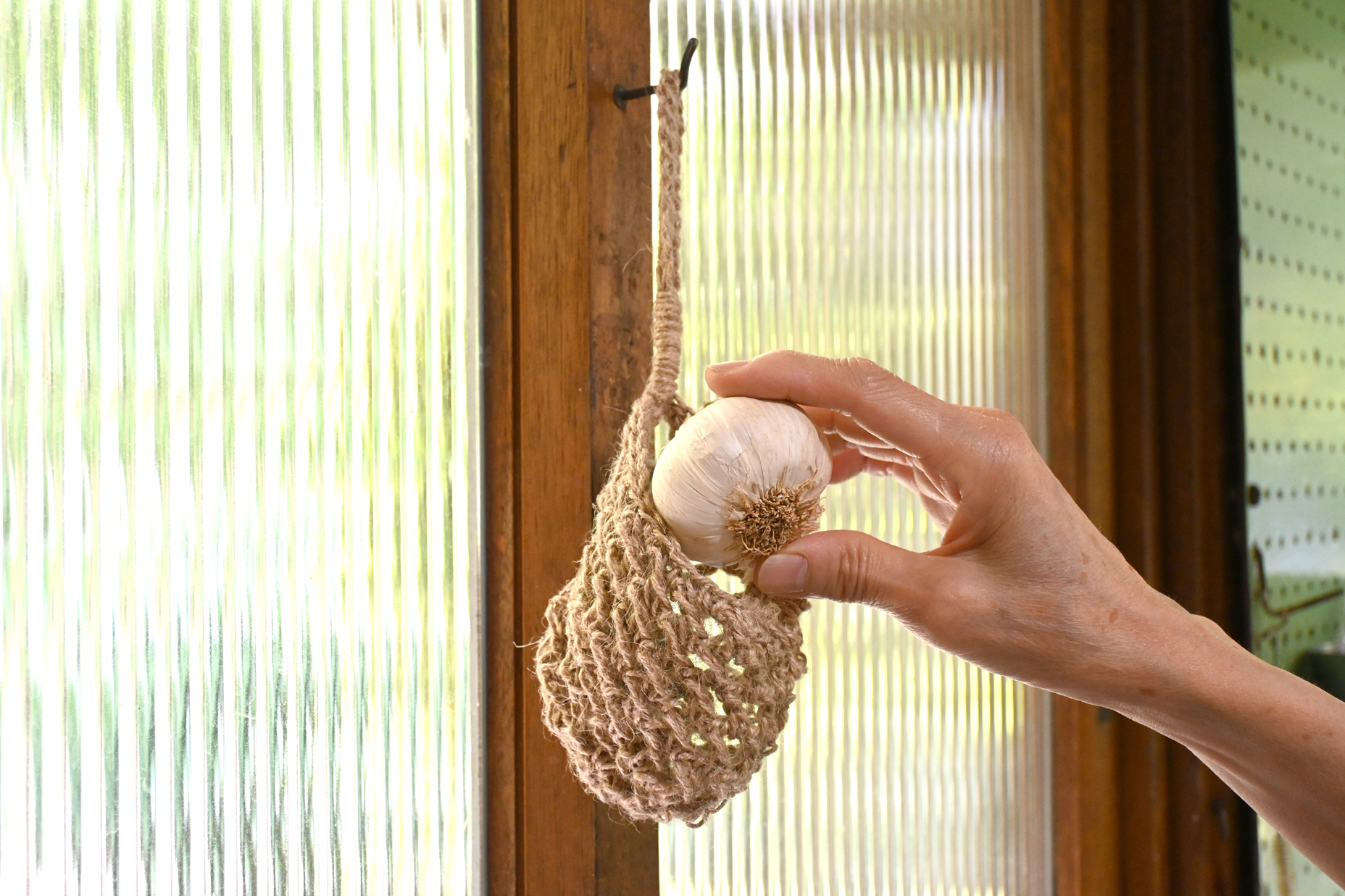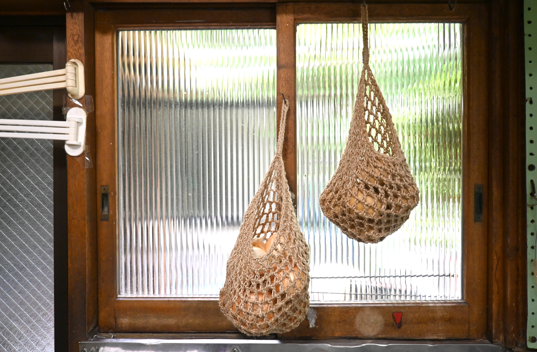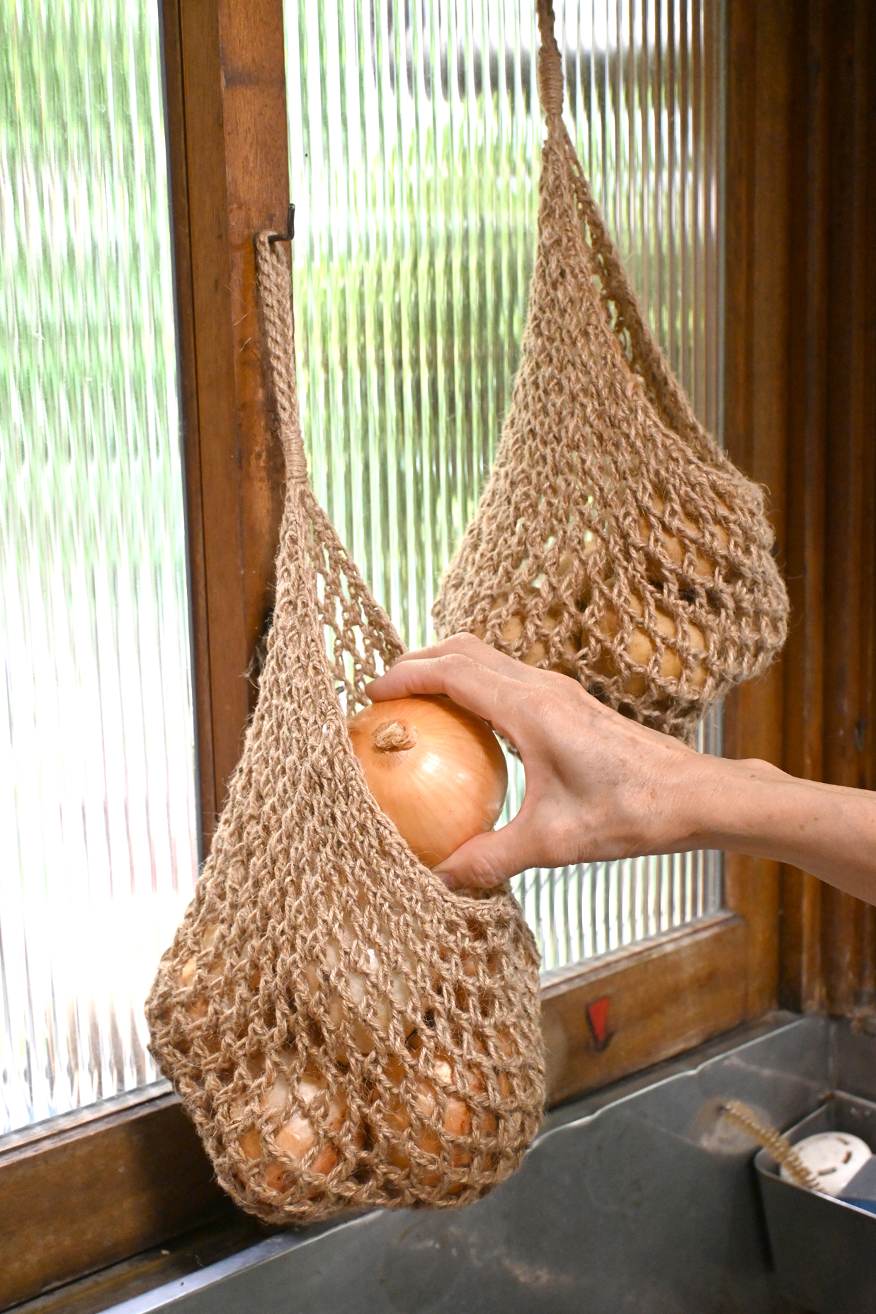 松野屋オリジナル商品の、麻ひもで編まれた野菜を保存するための袋。