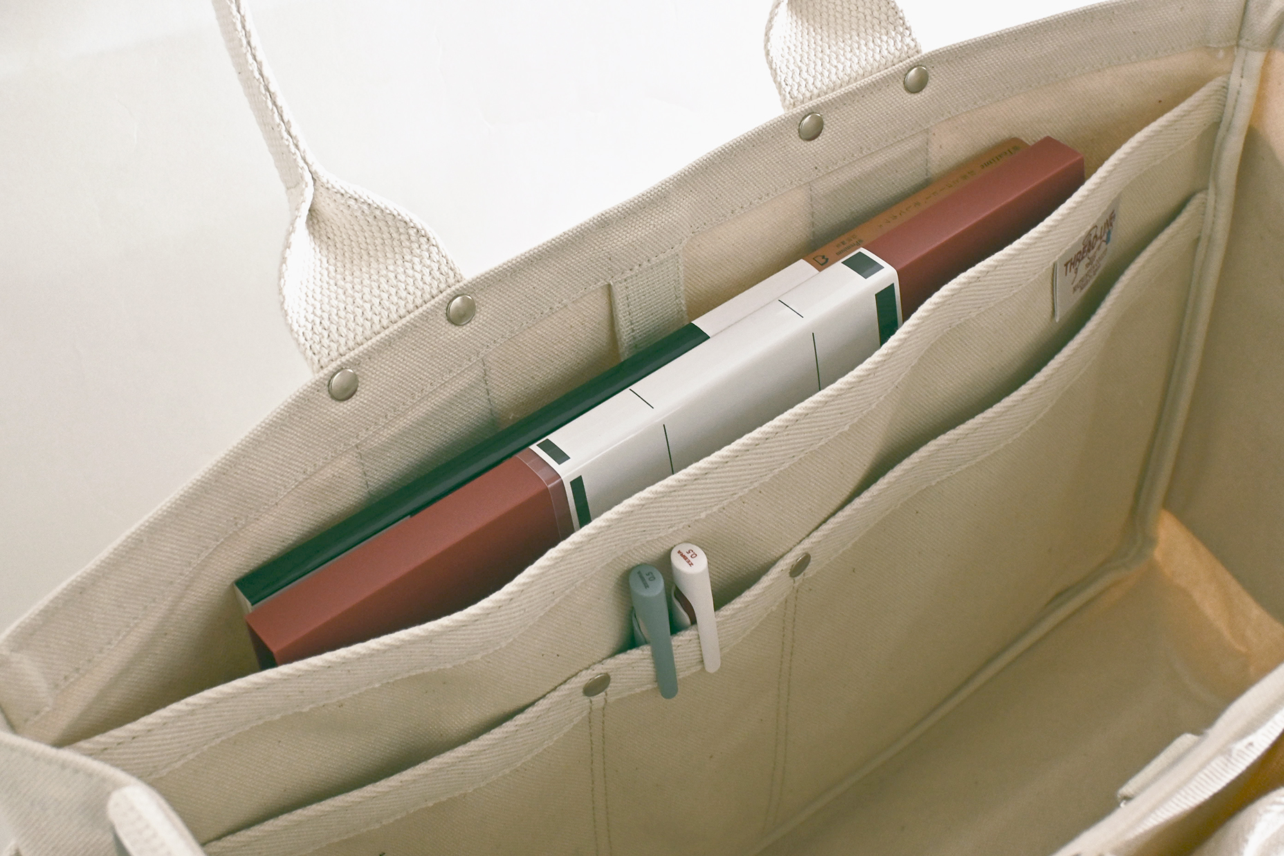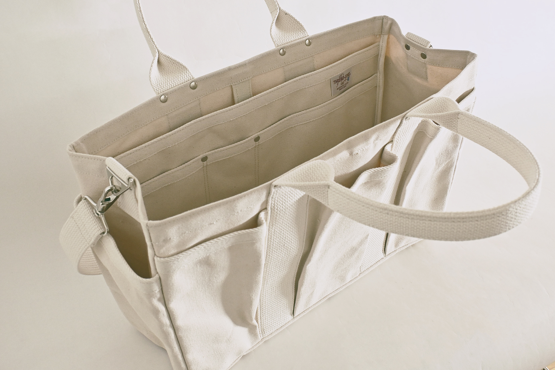 帆布素材のトートバッグ。大容量でたっぷり持ち運べるサイズです。