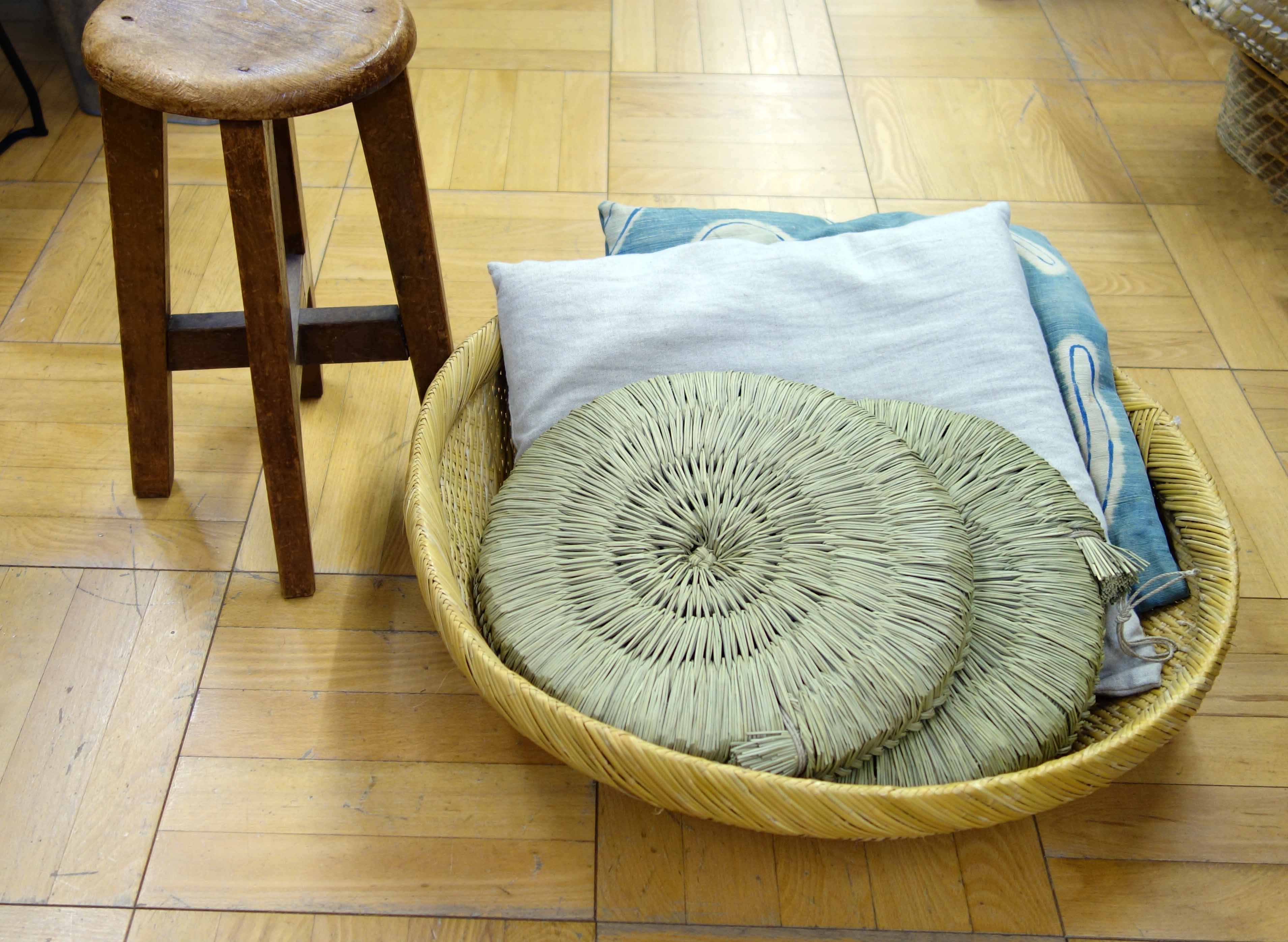 写真ではい草の円座(20-1421)2枚と450×450㎜の座布団2枚が入っています。