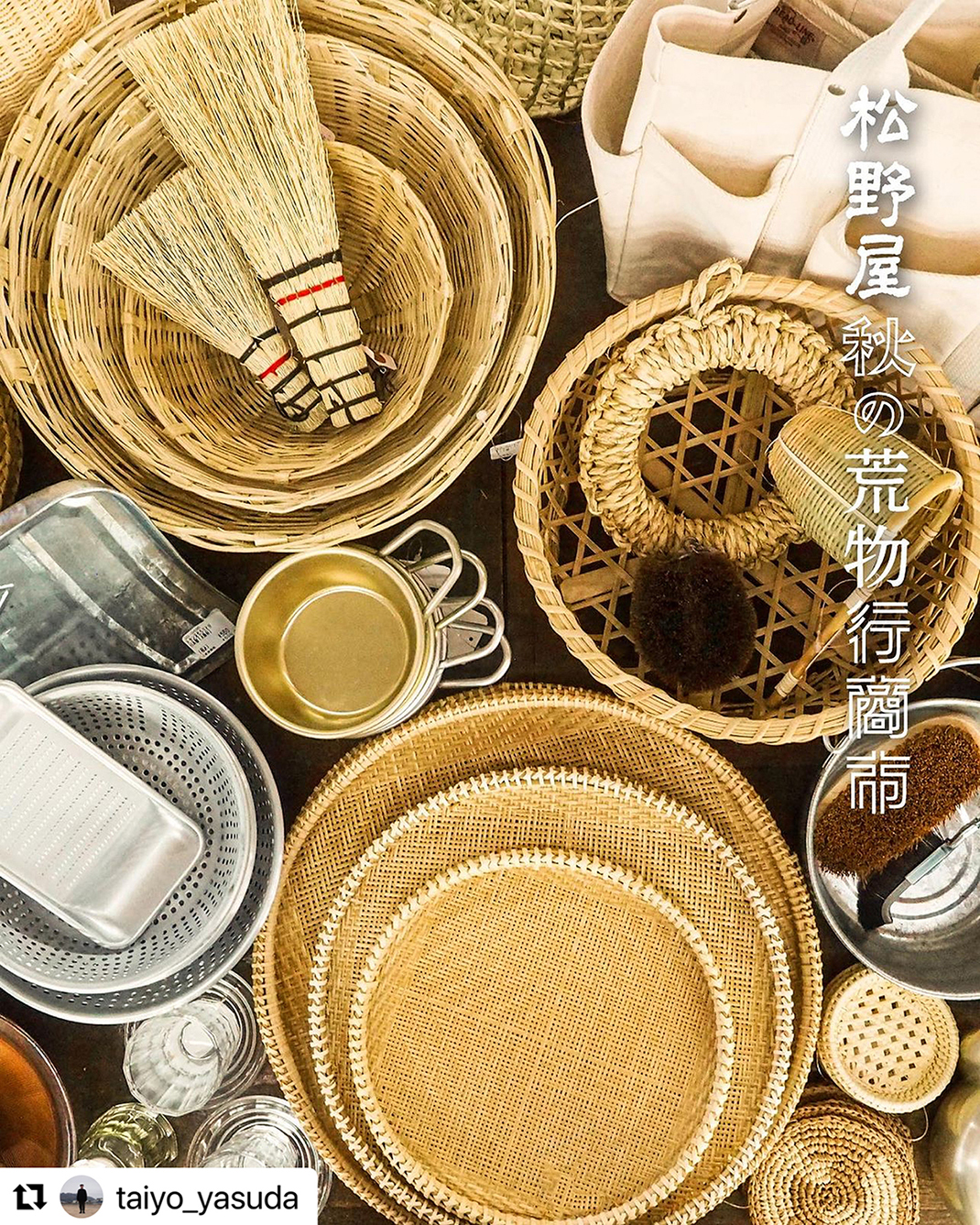 <荒物暮らしの1945年創業、日常の暮らしに根差した「民衆的手工業」から生まれる日用の荒物道具を扱う日本橋馬喰町に卸売専門店、谷中に小売店をもつ松野屋。松野社長ご夫妻は、使いやすく暮らしにちょうど良い道具たちとの出会いと荒物の良さを伝えるべく、国内外のイベントやTV、雑誌掲載、書籍の刊行などで活躍されています。