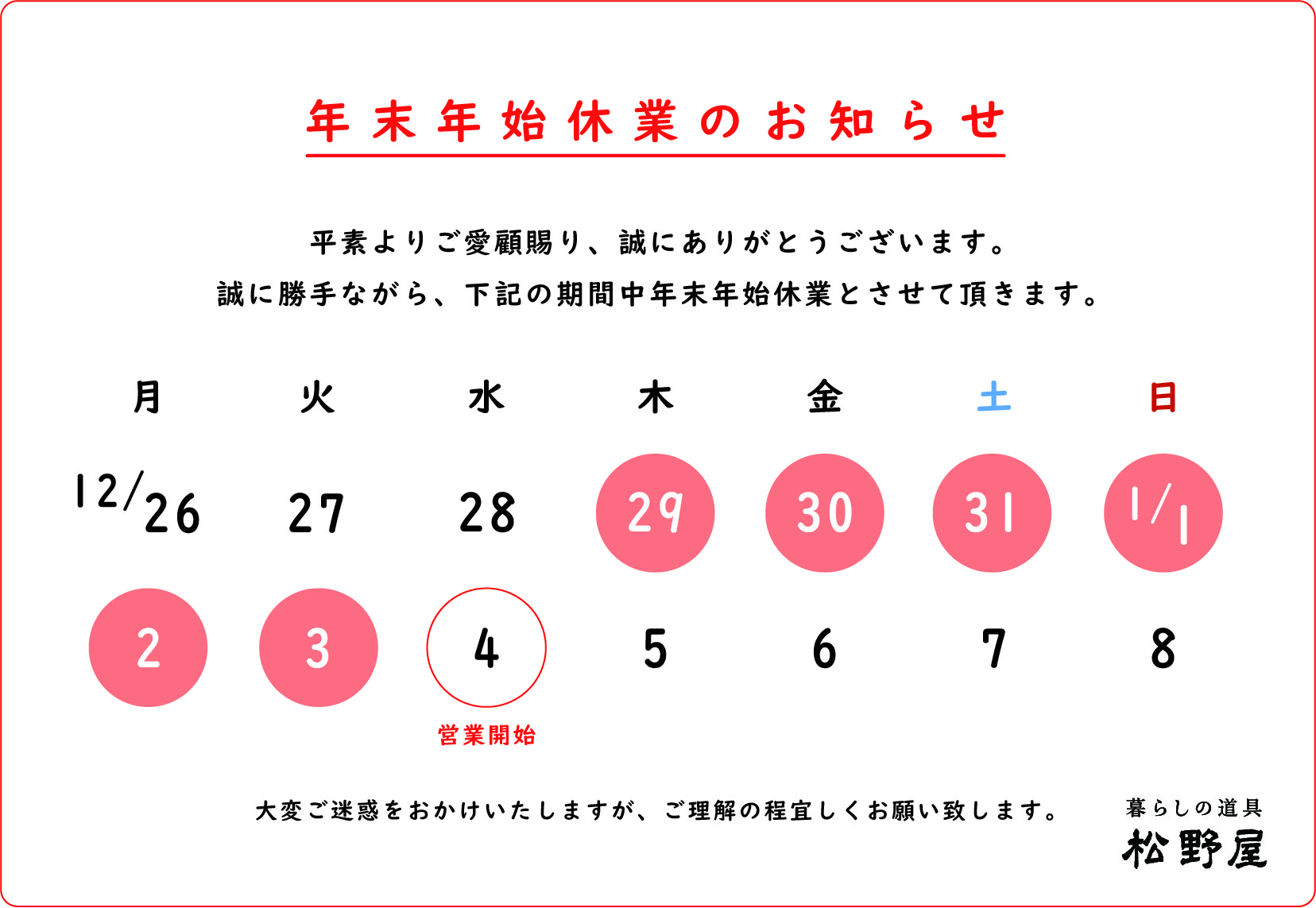 12/29(木) - 1/3(火) 休業