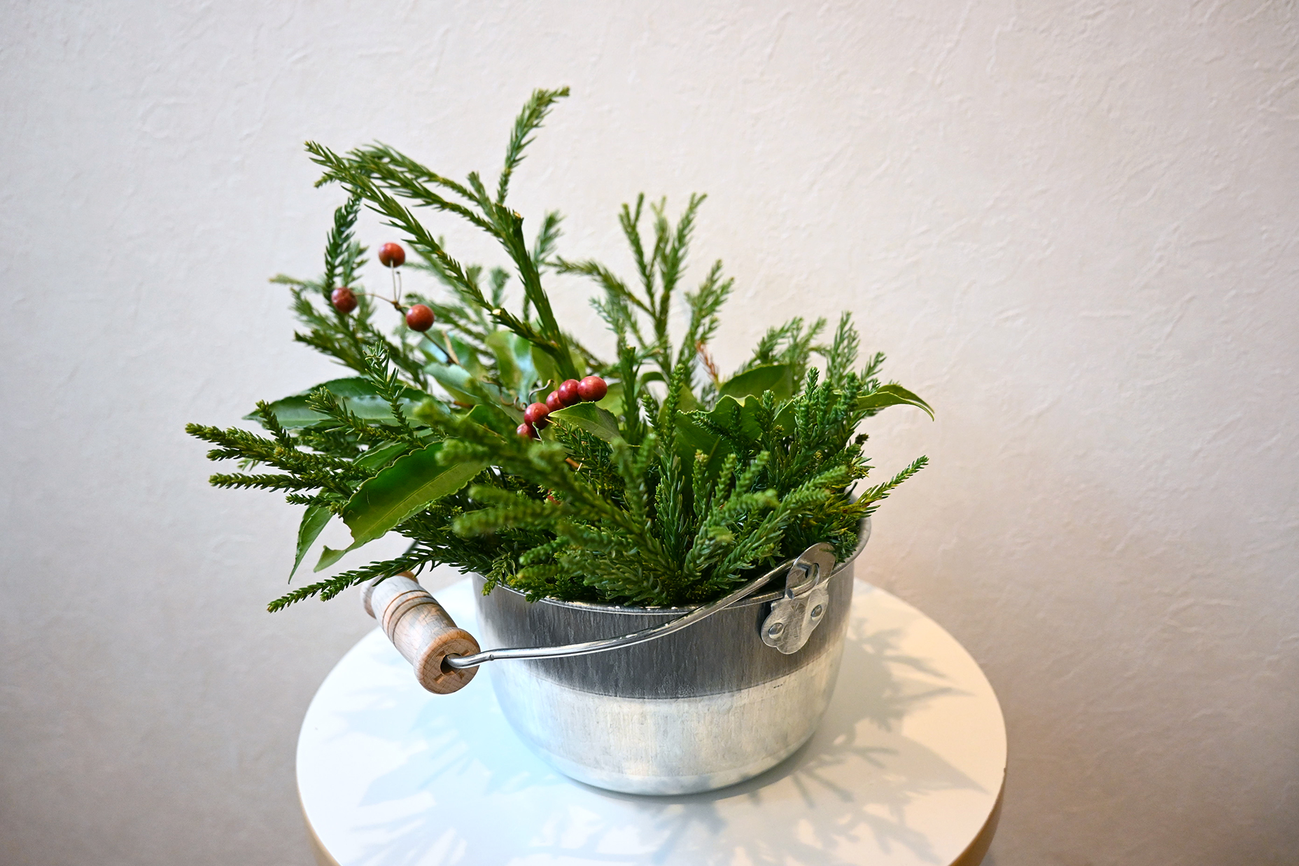 奥の植物がネパールトタンバケツに入って、素敵に飾られていました。