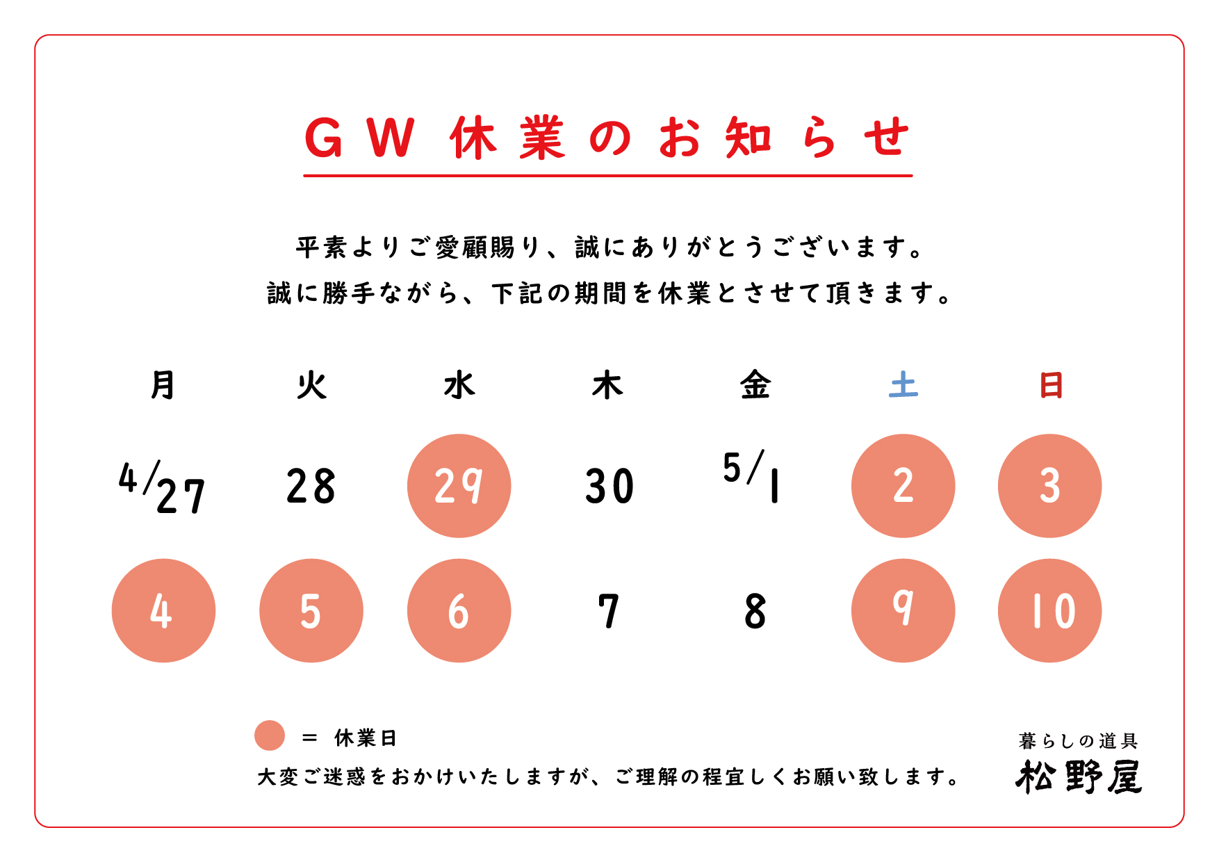 ゴールデンウィーク期間中の休業についてお知らせいたします。